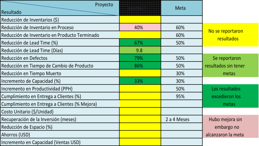 • Cada empresa reportó sus resultados de los indicadores fuera de las metas del programa que mejoraron en la aplicación del Programa Lean.