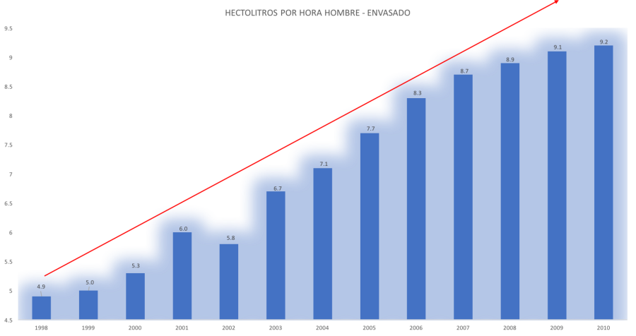 Incremento en la productividad medidadas en Hectolitros / Hora Hombre en Envasado