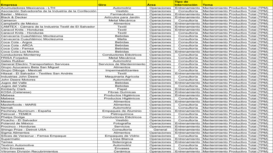 Listado parcial de los trabajos de Mantenimiento Productivo Total (TPM) que hemos participado exitosamente